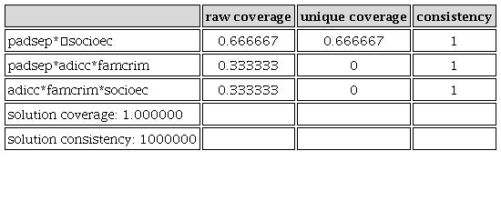 Conforme a la evidencia empírica, se encontró un patrón que demuestra que los aspectos familiares como la desintegración (padsep) tienen una mayor influencia en la reincidencia delictiva. Llama la atención que desde el modelo de Ragin, el grado de escolaridad, muchas veces relacionado con el acceso a oportunidades de educación y con el nivel socioeconómico (socioec) no explica razonablemente este fenómeno. Con ello se ponen en tela de duda algunas tesis como la de Sánchez y Toledo para quienes el grado de escolaridad de los niños y adolescentes es factor primordial de que sean proclives a delinquir; también se cuestionan aquellas afirmaciones de que cuando existe un importante fracaso escolar en el menor es muy común que aumente su grado de criminalidad.53