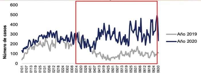 Lo anterior denota que, si bien hubo un decrecimiento, pese al proceso de aislamiento aún se presentan cifras significativas en materia de seguridad, lo cual también ocurre en materia de hurtos, toda vez que, antes de iniciar el aislamiento la cifra se enmarcaba en ochenta y cuatro (84) casos diarios, la cual se redujo a treinta y tres (33) casos al día45.
