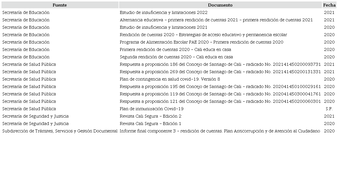 Para el abordaje de la gestión pública para la emergencia, en el caso de Santiago de Cali se revisaron alrededor de diecisiete fuentes documentales de tipología institucional (Tabla 1), entre las cuales se integran respuestas de la administración pública para la corporación Concejo Distrital de Santiago de Cali, que incluyen múltiples anexos donde se plantean las acciones realizadas por los sectores seguridad, salud y educación para el abordaje del escenario de pandemia. Este objeto de análisis tiene su revisión desde el análisis documental, el cual se considera como un proceso para buscar y entender significados y nociones que representen el contenido de los documentos3, entendiéndose a partir de este que se puede realizar dos tipos de procedimientos: indización y resumen; este último nos dirige hacia el análisis de información, el cual con base en autores como Dulzaines y Molina4 y Castillo5 se define como la intención de describir y representar textos de manera objetiva, integrando es estos nuevas interpretaciones y perspectivas encontradas sobre los mismos.
