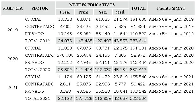 Al revisar los datos concernientes a educación, entre los años 2019 y 2021 se observó que hubo una disminución en la totalidad de las matrículas, sin embargo, en todos los niveles educativos del sector oficial aumentaron las cifras de matrícula (Tabla 2).
