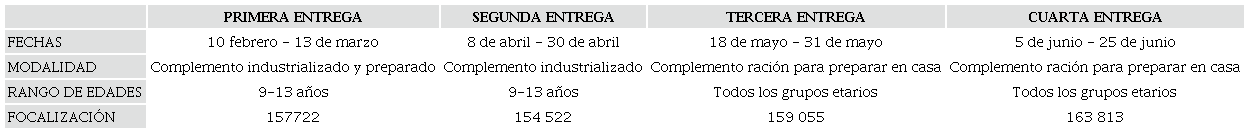 En relación con los programas de asistencia para la permanencia de la población estudiantil, dadas las limitaciones de movilidad acaecidas por la pandemia, en la vigencia 2020 se suspendió el servicio de transporte escolar37, y en el caso del programa de alimentación escolar, en el marco de la fase de emergencia por la covid-19 se adjudicaron cinco (5) contratos, y se modificaron las modalidades de entrega, pasando de una ración tipo industrializado a ración para preparar en casa (Tabla 3)38.