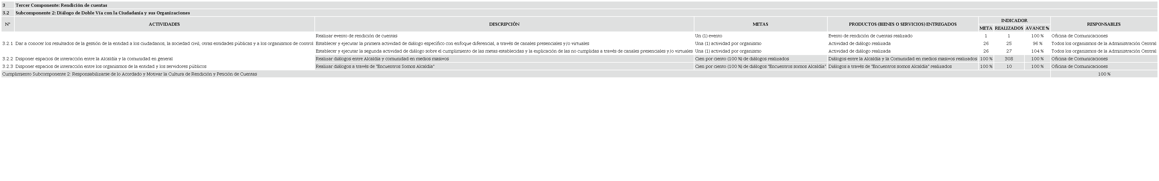 De los cuatro referenciados, son destacables los desarrollos de los subcomponentes dos y tres, en el caso del segundo para la vigencia 2020, se puede denotar un cumplimiento del 100 % sobre las actividades solicitadas (Tabla 4), y en cuanto al tercero del 127 % (Tabla 5), destacándose en el informe anual que cada organismo de la administración distrital tuvo como meta dos actividades de diálogo y rendición de cuentas, las cuales fueron cumplidas por los organismos a excepción del Departamento Administrativo de Hacienda Pública que solo tuvo una actividad, y la Secretaría del Deporte y la Recreación que realizó tres63.