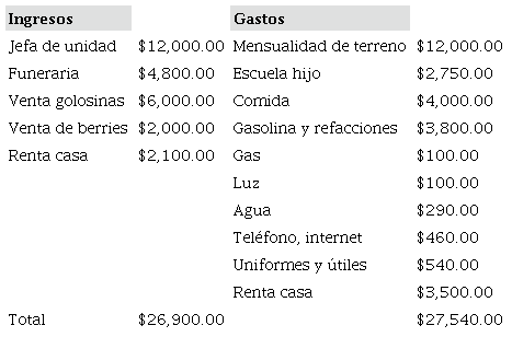 Su segundo empleo es en una maquiladora de ropa que es propiedad de su hermano. El trabajo consiste en hacer ojales, pegar botones, remaches y etiquetas y empacar la ropa. El pago es a destajo: le pagan 50 centavos por prenda y alcanza a hacer un promedio de 100 prendas por hora. Trabaja cinco horas de lunes a viernes y 10 horas los sábados. Sus ingresos son de $1,700.00 por semana, lo que da $6,800.00 mensuales. Esto es en temporada alta, que son los meses de noviembre-diciembre y abril-mayo. En temporada baja no asiste los fines de semana, por lo que genera ingresos de alrededor de $3,000.00 mensuales. Tiene la ventaja de que como le pagan a destajo y el patrón es su hermano, puede faltar cuando tiene reuniones en la escuela de su hija, citas con el doctor o alguna otra salida urgente. De su participación en la tiendita de la biblioteca le quedan alrededor de $150.00 pesos al día, esto es $3,000.00 al mes.