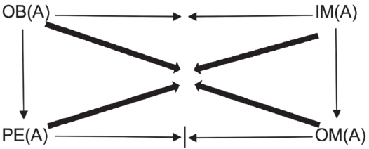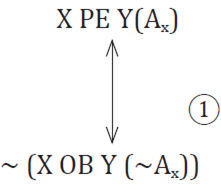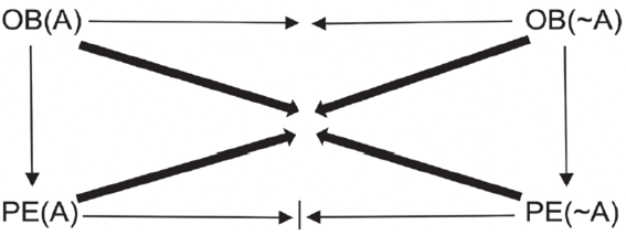 Next, if one is obligated to do some action, then one is permitted to do that action; and likewise, if one is obligated not to do some action, one is permitted not to do that action. Thus, the two vertical lines of one-way implication from OB(A) to PE(A) and from OB(~A) to PE(~A). But the converse is not true: if an action is permitted, it need not be obligatory to do it. Rather, an action can also be permitted in the sense that it is optional. Thus, there is only a one-way implication running from OB(A) to PE(A), and from OB(~A) to PE(~A). Also, because OP(A) is equivalent to OP(~A), one will necessarily be permitted to do some action if not doing that action is optional, permitted not to do something if doing that action is optional. Thus, the one-way implication depicted running from OP(A) to PE(~A) and from OP(~A) to PE(A).