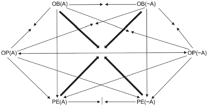 Focus now on the bottom part of the hexagon. Basic even to the most minimal deontic logic is that one is not permitted to do what one is obligated not to do, nor is one permitted not to do something one is obligated to do. Thus, the criss-crossing relations of contradiction (which gave Aristotle’s square of opposition its name) between OB(A) and PE(~A), and between OB(~A) and PE(A).