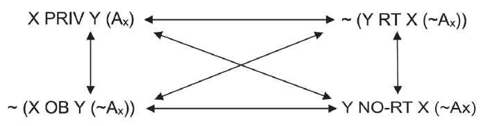 One worry about the systematcity of a scheme built on there being “co-dependent actions” stems from the relations of content Hurd posits to exist between the contents of her correlative rights and duties. The correlative she posits is: if X RT Y (X do A), then Y OB X (Y not prevent (X do A)). It is instructive to compare Hurd’s content-relation between action/prevention-of-action pairs, with the content relations in Hohfeld’s two correlativity claims. Between the contents of claim-rights and correlative duties, the subject of Hohfeld’s correlativity thesis for passive rights, Hohfeldians proudly point out that their common content is “one and the same action”.59 If X has a right that Y not go on X’s land (a passive right), then Y has a correlative duty that Y not go on X’s land. Such identity of content is not to be expected between the contents of privileges and their correlativity-related absence of rights, the subject of Hohfeld’s correlativity thesis for active rights. But Hohfeldians can at least claim for privileges that the contents of the correlatives are “logically related”:60 a privilege of X as against Y that X do A, is correlated with an absence of a claim right by Y as against X that X not do A, which correlative itself requires an absence of a duty by X to Y that X not do A. So long as “not” in such content shifts (across correlatives and opposites) denotes the logical connective of negation, this too, it is said, comports with the requirements of the Hohfeldian scheme being one of “logic”.