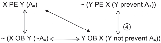 Now one can see the content relations presupposed by Hurd in its true light: there is indeed a shift from the content of a permission that X do A to an obligation that Y not prevent X do A, namely, a shift to, “Y not cause X not to do A”. But there is also a shift for Hohfeldians from the content of a privilege that X do A, first, to the correlative absence of a right for Y that X not do A, and second, to the negated opposite, which is, the absence of a duty by X that X prevent himself from doing A, the content of which in turn is just, “X not cause X not to do A”. The Hurdian shift in content requires a shift in agents whereas the Hohfeldian shift does not; but that is it. The moment that agential involvement is made explicit in the deontic logic of actions and omissions, the comparative shifts in content between the two schemes can be seen in this minimally differing way.68