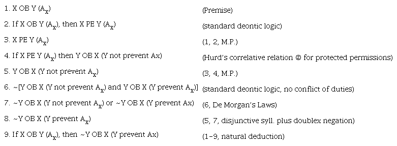 Yet are the Hurdian content connections any less systematic and “logical?” In the Hurdian logic the correlative of X’s permission (that X do A) is a duty on the part of Y (that Y not prevent X do A). The “X do A” part of the content seems to be identical as those contents are phrased; yet this is an illusion. Preventions are inherently negative: to prevent something is to cause its non-existence.61 So really the Hurdian correlative of a permission of X as against Y for X to do A is a duty on Y not to cause it to be the case that X does not do A. Not identity, but still the logical relation of negation -except for the “cause it to be the case” bit, a bit that has no analogue in the content of X’s correlative permission.