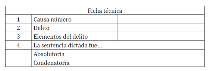 a) Ficha té́cnica: con la finalidad de tener un control sobre la sentencia analizada, se generó la ficha técnica, que incluye lo siguiente:
