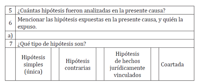 d) Las hipó́tesis: las siguientes preguntas del instrumento se refieren al análisis de las hipótesis que fueron planteadas por las partes, con la finalidad de estudiar si el tribunal escogió la hipótesis más probable; estos cuestionamientos se hacen a cada una de las hipótesis propuestas por las partes. Sin embargo, no hay que olvidar que, si bien del instrumento puede resultar que la hipótesis con mayor apoyo en evidencia es la hipótesis H, es necesario identificar qué tipo de hipótesis es y quién la propuso, en virtud de que dependiendo de quién la haya introducido al proceso se le aplicará un estándar de prueba distinto.