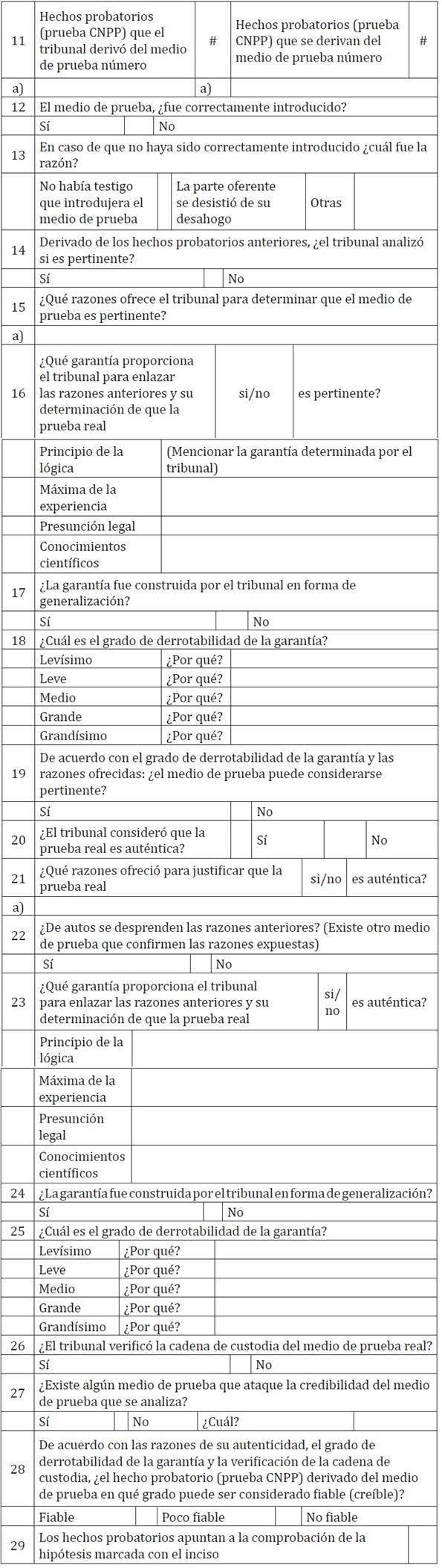 c) Pruebas: este apartado es la parte medular del instrumento que pretende obtener información sobre los dos primeros momentos por los que el juzgador pasa para tomar una decisión: seleccionar los medios de prueba, así como su valoración y construcción de la inferencia probatoria. De las preguntas 8 a la 10, que no aparecen en este trabajo, se cuestiona el número de medios de prueba ofrecidos, se enumeran los mismos y se identifica el tipo de medio de prueba.