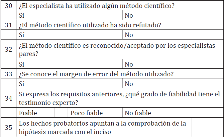 iii) En caso de estar frente a un testimonio experto (perito). Se realizan las preguntas marcadas en la tabla anterior, y también se sustituye la palabra auténtica por veraz, objetiva y sensibilidad observacional.