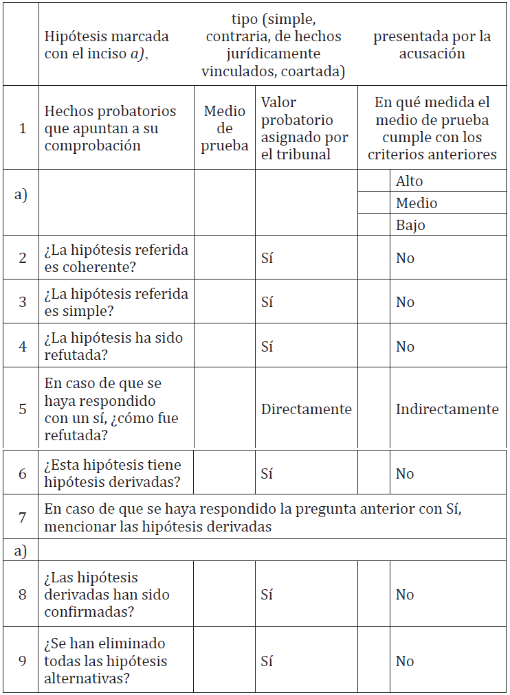 Por ello, las preguntas número 6 y 7 del instrumento cuestionan cuáles son las hipótesis formuladas y quién las formula, así como qué tipo de hipótesis son, ya que, partiendo de ahí deberá de observarse el instrumento. Consecuentemente, atendiendo a lo expuesto en el apartado del estándar de prueba sobre el tipo de hipótesis, estas preguntas deben hacerse en los siguientes casos: 1) a las hipótesis de la acusación, y 2) a la hipótesis de la defensa, si el fallo será de absolución por haberse acreditado la inocencia del acusado.