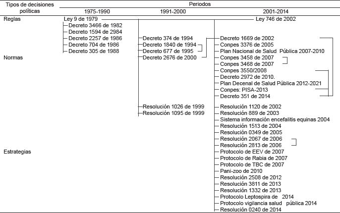 Las relaciones entre las políticas se dan por los contenidos generales, parciales o específicos en zoonosis, los cuales con frecuencia involucran también enfermedades transmisibles y la salud ambiental. El esquema de relaciones indica que, desde un punto de vista general, las políticas de zoonosis en Colombia conforman un entramado de largo plazo y abundante en decisiones de diferente tipo (Figura 1 y 2).