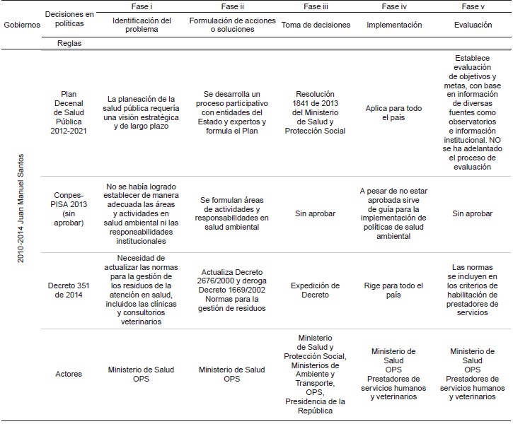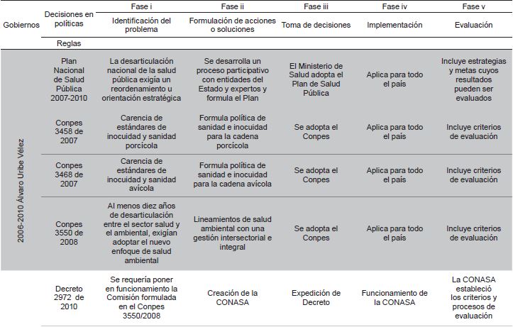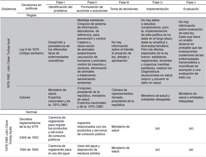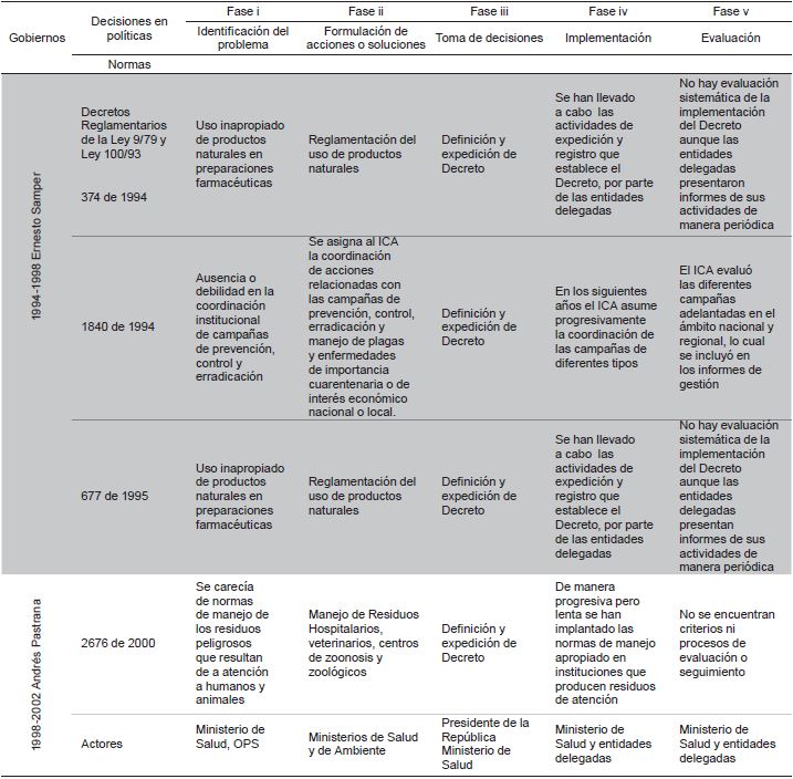 En este periodo el cumplimiento de las fases de política esperadas es variable y parece estar ligado a la institución a cargo 26-32. A continuación, se presenta resumen del proceso que incluye únicamente las reglas y las normas (Tabla 3). En este periodo también se dio un amplio desarrollo de medidas de implementación que materializan las políticas (Figura 1).