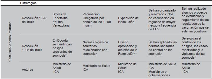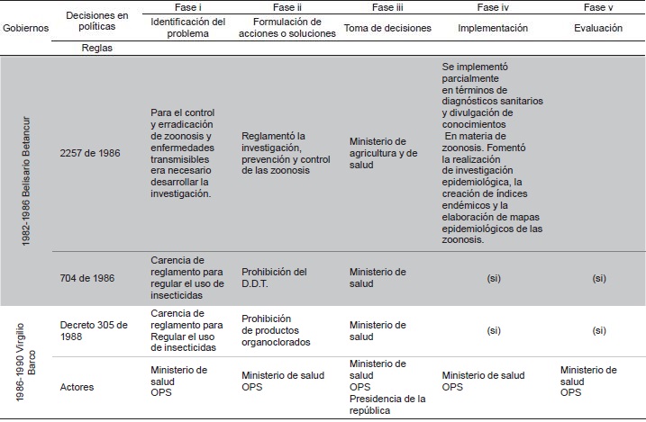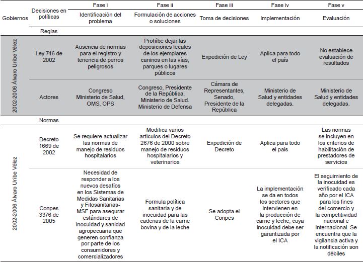 En este periodo la gran mayoría de políticas de zoonosis llegaron hasta el proceso de identificación del problema y la formulación de soluciones; algunas pasaron por el proceso de toma de decisiones y muy pocas evidencian la fase de implementación y evaluación 12-16. A continuación, se presenta el resumen del proceso (Tabla 1).