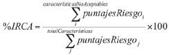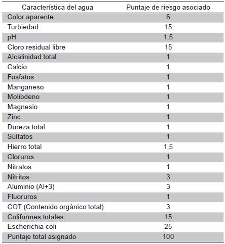 En el Decreto 1575 de 2007 10, se define el (IRCA), como un indicador para estimar el riesgo de incidencia de enfermedades asociadas al no cumplimiento de las normas sanitarias del agua para consumo humano. Por otra parte, la Resolución 2115 de 2007 establece el procedimiento de muestreo de las fuentes de agua y el cálculo del IRCA, que consiste en ponderar el puntaje de riesgo asignado a cada una de las características físicas, químicas o microbiológicas obtenidas de los muestreos de agua. Dichas características se presentan en la Tabla 1: