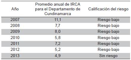 Objective : To analyze the results of the Water Quality Risk Index (IRCA) in the 116 municipalities of the department of Cundinamarca, between 2007 and 2013.