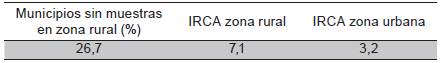 Adicionalmente, se encontró que un 26,7% de los 116 municipios no reportaron IRCA para su zona rural, lo cual implica que los valores estimados en el informe, pueden estar sobrevalorando la calidad real del agua entregada a los habitantes.