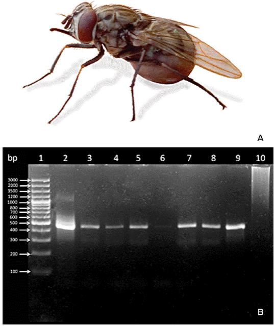 Catches were done in the morning and in the afternoon, twice a week (except for one catch in one week of September and one catch in one week of December) for a total of 12 catching days during September, October, November and December 2015. Flies were identified as Stomoxys calcitrans according to morphological characteristics (seven to eight mm in length and look like house flies).13 They can be distinguished by belly marks in the form of chessboard and by the mouthparts for skin piercing (Figure 1A).13 Only those stable flies showing evidence by visual inspection of having taken a blood meal were collected (Figure 1A - photograph obtained by Carlos R. Bautista-). It is worth mentioning that no other haematophagous dipterans were identified at the time of the study. Immediately after capture, batches of 15 flies were placed in an Eppendorf vial (2 mL), and then the specimens were anesthetized through cold to manipulate them until processed. Whole ground fly batches were stored at -70 °C and prepared as described by Scoles et al.6 DNA extraction was carried out using the UltraClean™ BloodSpin™ DNA Isolation kit (MO BIO Laboratories Inc., Carlsbad, CA, U.S.A.) following the manufacturer´s procedure.
