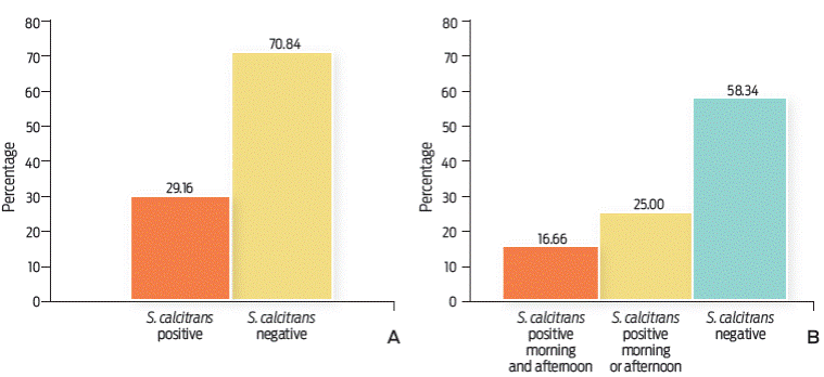 Seven out of 24 S. calcitrans groups were positive for A. marginale as detected by a nested PCR, and an expected amplicon size of 466 bp (Figure 1B). This represented 29.16 % of all the samples (Figure 2A). It was also observed that on two occasions, the S. calcitrans batches collected on the same day (morning and afternoon of October 22nd and of November 4th), were positive for A. marginale (16.66 %), while those S. calcitrans batches collected in the afternoon of October 1st, morning of November 6th, and afternoon of December 1st (25 %) were positive for the rickettsia (Figure 2B).
