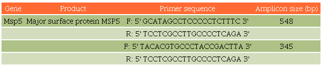 Samples were tested for A. marginale DNA using a nested PCR (nPCR) that targets the amplification of a fragment from a single copy gene that encodes the outer major surface protein MSP5 from A. marginale. Reaction and amplification conditions were carried out as described by Torioni et al,13,14 using appropriate positive and negative controls. Sequences for the primers used were based on Torioni et al.13 and the expected amplicons are described in Table 1.