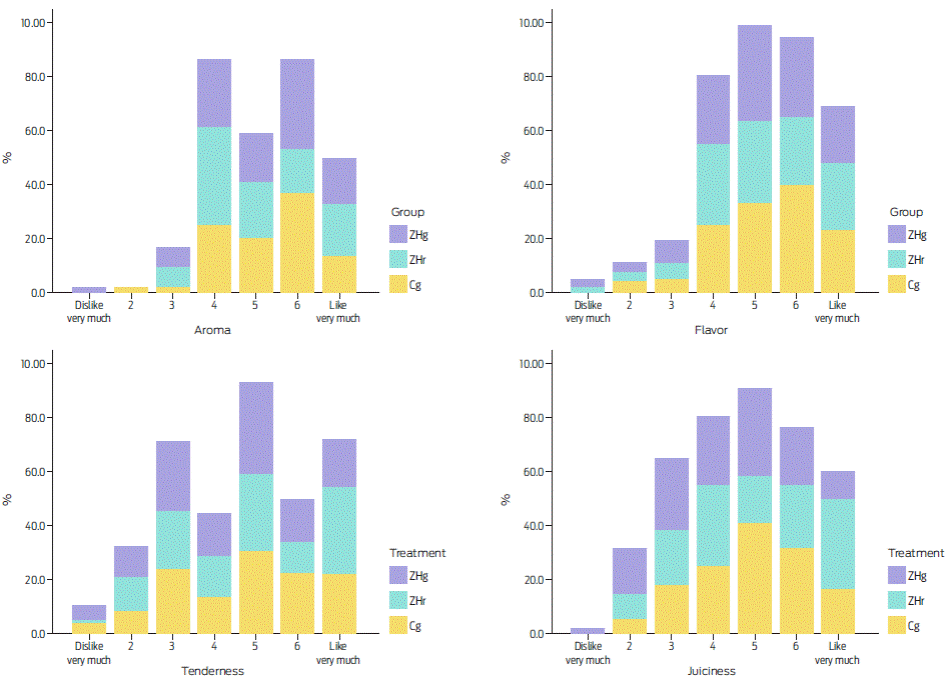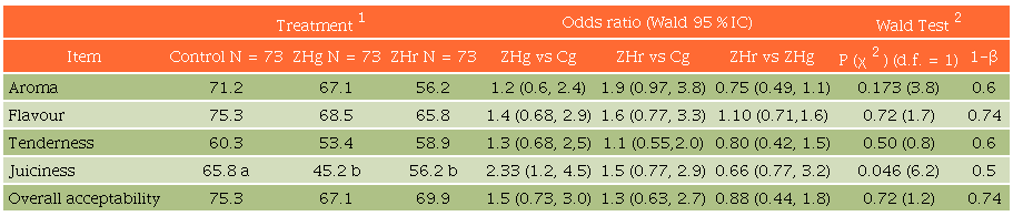 Zilpaterol supplementation (ZHg and ZHr) did not modify the consumers’ scores for odour, taste and softness of the Longissimus dorsi muscle (P = 0.50; Wald χ2 test = 0.8; d.f. = 2). Table 5 summarizes these data. For these attributes, more than 65 % of consumers assigned scores ranging from 5 to 7 (i.e., I liked it lightly, and I really liked it) as observed in Figure 2. Meat juiciness from animals treated with either ZHg or ZHr presented lower scores (≤ 5) compared with the untreated animal meat (P = 0.046; χ2= 2; N = 219).