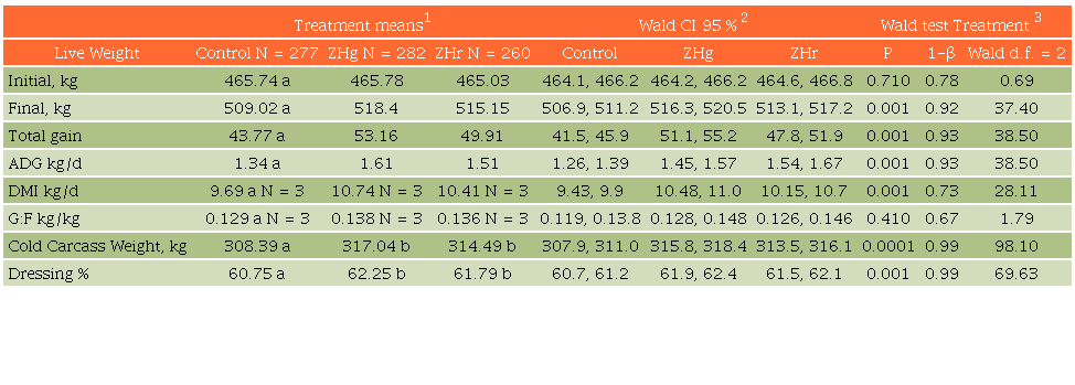 Few countries have approved ZH use for the final phase of fattening beef cattle, and until now, non-inferiority data for generic preparations were lacking. One exception is an essay that estimated carcass quality when using a generic ZH brand (Grofactor® Virbac, Mexico)21; however, as environmental conditions are key factors for the well-being and fattening efficiency of bulls, that study failed to disclose details on the cattle housing such as shade surface or how the feed was served. Consequently, this is the first carefully structured trial to compare productive variables from a non-inferiority perspective, conducted under humid tropical conditions in cattle with a marked Bos indicus genotype.