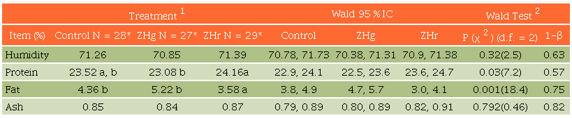 Proximal chemical analysis data for the Longissimus dorsi muscle are presented in Table 4. The findings indicate that supplementing either commercial ZH brand does not modify the moisture, fat or ash content in the muscle (P = 0.32; Wald c2 test = 2.5; d.f.= 2), compared with the ZH-free animal meat (1-β = 0.63). The ZHr protein percentage was higher than that of the ZHg and control groups (24.16 and 23.52 %, respectively), and the test powers were between 0.6 and 0.82.