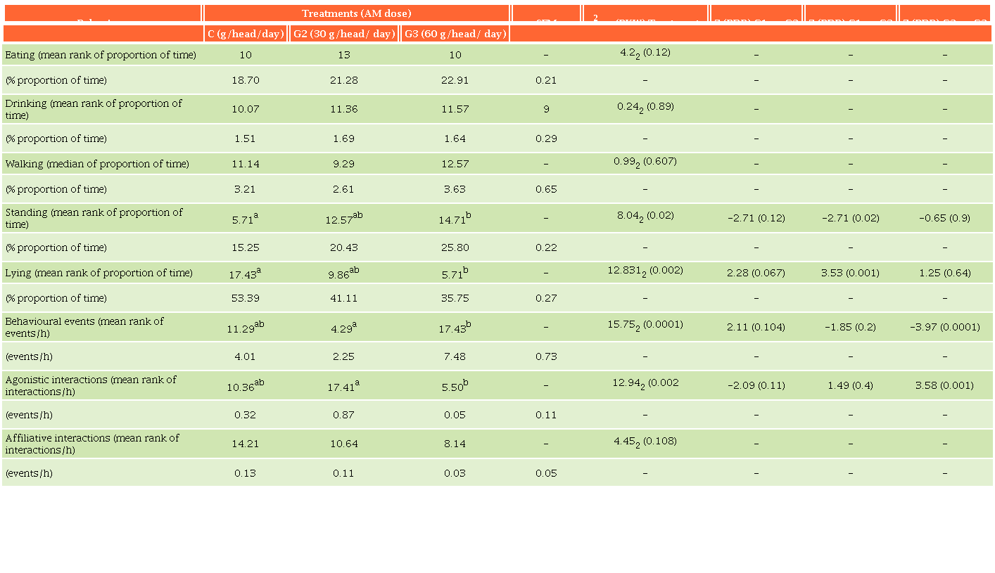 Differences in proportions of time of individual behavior and frequencies of social interactions by treatment were tested using the Kruskal-Wallis test (KW). If significant (P < 0.05), pairs of mean ranks were compared using the Dunn-Bonferroni (DB) test adjusted with the Bonferroni correction. A linear effects mixed model (LEM) with ‘AM dose’, ‘sampling day’, and ‘AM dose*sampling day’ as factors and ‘bull’ as a random factor was established to evaluate the effects in blood cellular components and biochemical indicators. F-values were approximated using the Kenward-Roger procedure as a standard SPSS method, thereby obtaining noninteger values for the denominator degrees of freedom. Residuals were tested for normal distribution with the Shapiro-Wilk test, and if not normally distributed (P ≤ 0.05), data were transformed using square root or logarithm10, whichever most effectively returned residuals to a normal distribution. When LEM results were significant, a post hoc Bonferroni test was used to compare means (P ≤ 0.05). If residuals were not normal after transformation, values were analyzed with KW as explained above. Calculations were performed with the program IBM SPSS statistics, version 20.