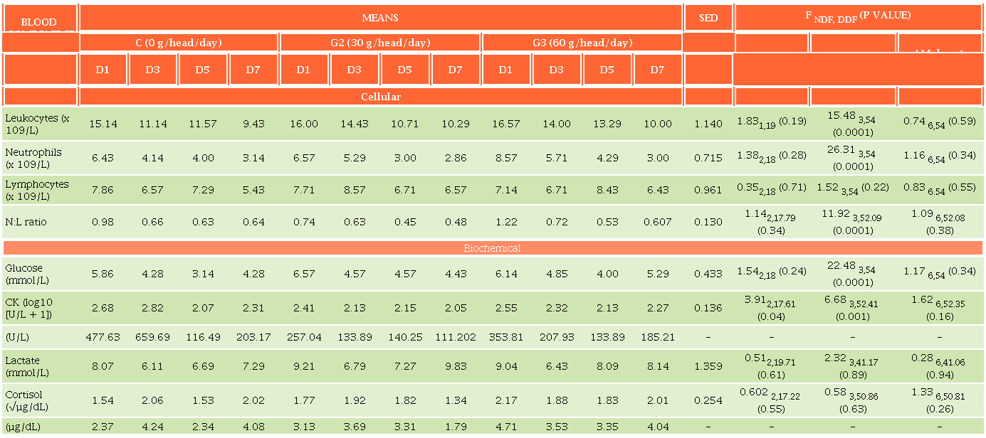 CK activity was higher in C than in G2, with G3 being the intermediate (P = 0.04). No differences in the other indicators were observed with AM supplementation. Glucose concentration was higher on D1 than on the rest of the days (P = 0.0001, FNDF, DDF = 22.48 3, 54; D1 = 6.19 mmol/L, D3 = 4.57 mmol/L, D5 = 3.905 mmol/L, D7 = 4.67 mmol/L). CK activity was higher on D1 than on D5 and D7, with the lowest activity on D5 (P = 0.001, FNDF, DDF = 6.68 3, 52.41; D1 = 353.8 U/L, D3 = 262.6 U/L, D5 = 129.01 U/L, D7 = 161.929 U/L). The sampling day affected AST activity, as the values were significantly higher on D1 and D2 than on D5 and D7 (χ2DF = 29.643, PKW < 0.001; mean ranks: D1 = 62.07 U/L, D3 = 50.71 U/L, D5 = 27.52 U/L, D7 = 29.69 U/L).