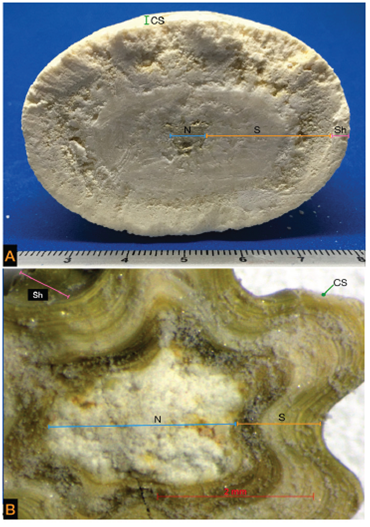 Different layers form the structure of a urolith: the nucleus or nidus in the centre, which begins the formation of a urolith and may have a mineral origin, a protein matrix, or foreign bodies such as a suture; the stone or calculus which has multiple laminations that give body or volume to the urolith; and the shell, which is the last complete layer. The surface crystals comprise the outermost and incomplete layer Figure 2. Each layer has a mineral composition which may be similar to or different from the others.4