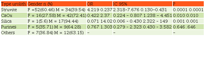 Based on mineral composition, the most frequently presented uroliths were those of struvite, accounting for 44.10%, followed by CaOx 29.74%, silica 9.23%, and purines 7.17%. These data are similar to a previous study in Mexico City,11 where it was observed that these minerals are the most frequent and were present in almost the same rates. However, this is different from what is reported in other geographical areas.