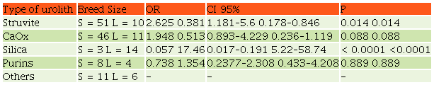 The most frequent type of urolith 44.10% was struvite n = 86, followed by 29.74% CaOx n = 58, 9.23% silica n = 18, 7.17% purines n = 14, 1.02% calcium phosphate n = 2, 5.64% mixed uroliths n = 11, and 3.07% compound uroliths n = 6. The frequency of different types of urolith in relation to gender and age group is shown in Table 1, the risk analysis of predisposition of gender to present some type of urolithiasis in Table 2, and the association between urolith type and breed size in Table 3.