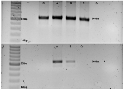 For the first reaction, the primers described by Sroka et al (2009) were used: Pml/S1 (5’-TGTTCTGTCCTATCGCAACG-3 ‘) and Pml/AS1 (5’-ACGGATGCAGTTCCTTTCTG-3’). For the second reaction, the following primers were used: Pml/S2 (5’-TCTTCCCAGACGTGGATTTC-3’) and Pml/AS2 (5’-CTCGACAATACGCTGCTTGA-3’). Both reactions amplified a 560 base pair (bp) segment. Reagents used in both reactions had the following concentrations in a final volume of 25µL: 5X PCR Buffer, 25mM MgCl2, 1mM dNTP´s, 10µM of each primer, 5U Taq polymerase (Thermo Scientific® Inc.; Waltham, Massachusetts, United States), 3ml template DNA, and distilled water. The thermocycler conditions were: initial denaturation at 95 °C for three minutes, followed by 35 cycles at 95 °C for 30 seconds, 64.2 °C for 30 seconds, and 45 °C for 45 seconds; the final extension was 72° C for five minutes.