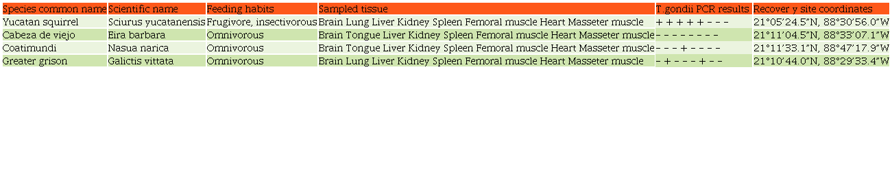 Keywords: Toxoplasma gondii, roadkill, wild animals, Yucatan, Mexico.