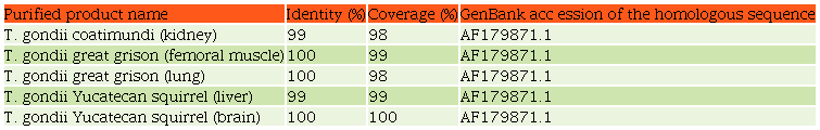 Identity and coverage percentages obtained in the BLAST analysis are shown in Table 2. All sequences were homologous to a previously sequenced T. gondii.