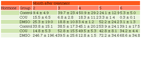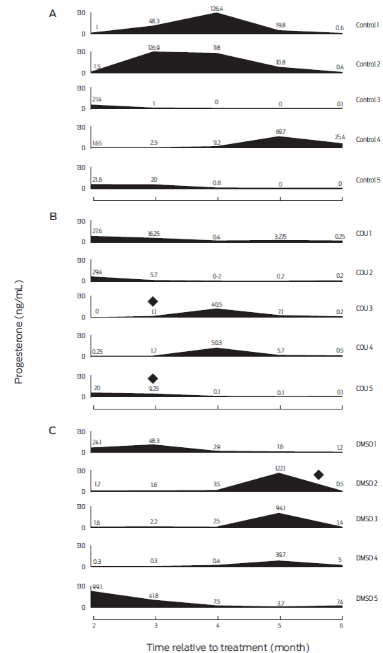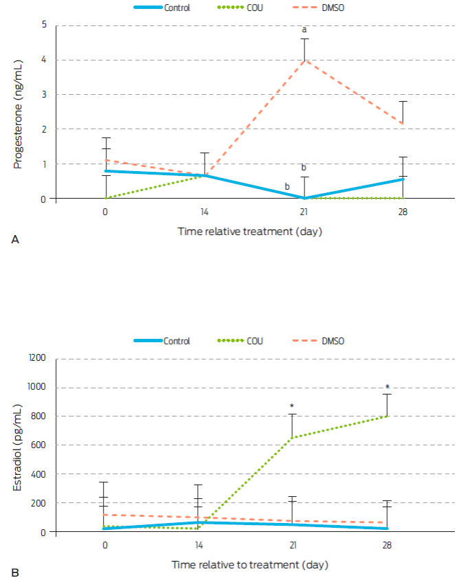 Levels of P4 and E2 remained constant and did not differ between groups from the second to the sixth post-treatment months (Table 1). This suggests that even when there is a delayed effect of COU and/or DMSO administration (first detected on day 21 post-treatment), this effect is relatively short, since no changes in hormone levels were observed beyond day 28. In particular for COU, this result could relate to an interaction between COU and the ER.32 There is no evidence of DMSO binding to ERs but it can increase ERα and ERβ in salmon hepatocytes,19 thus it may have direct or indirect actions through the E2 pathway.