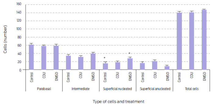 DMSO, when administered alone, did increase the number of superficial nucleated cells at day 28 post-treatment (P=0.007; Table 2). In fact, superficial nucleated cell number was higher during the post-treatment day 28 in DMSO treated animals than in any of the other groups ((P=0.056; Figure 2). Thus, DMSO showed an estrogenic effect in vaginal cells without an observed increase in either P4 or E2 serum levels. An enhanced number of parabasal cells after DMSO administration has been reported in periovulatory stage bitches.15 Hence, DMSO may have different effects on vaginal epithelium according to the stage of the estrous cycle at which it is given.