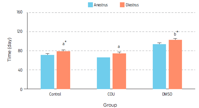 Length of anestrus was not affected by treatment (Figure 3). However, diestrus was longer in the DMSO group when compared to control (P=0.060) or COU (P=0.018) treated animals. The physiological mechanism to explain this result, was not assessed in this study. However, since DMSO increased serum levels of P4 on day 21 post-treatment, a cystic-like effect could have been induced which may have prolonged diestrus.