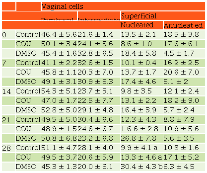 A single administration of COU did not affect types (Table 2) or numbers (Figure 2) of vaginal cells in anestrus bitches; whereas number of parabasal cells was reduced and that of superficial anucleated cells increased in periovulatory animals15. Again, this difference could come down to the stage of the estrous cycle when treatment was applied. However, this may not be the case15 for other species. COU and other phytoestrogens induce a cornification of the vaginal epithelium that is independent of reproductive status or age in rodents. Similarly, observed changes in vaginal epithelium of women appeared to be more related to phytoestrogen consumption than to reproductive state.33