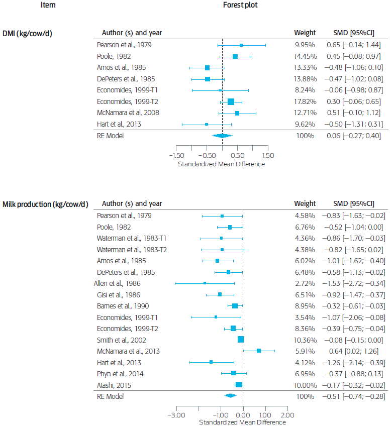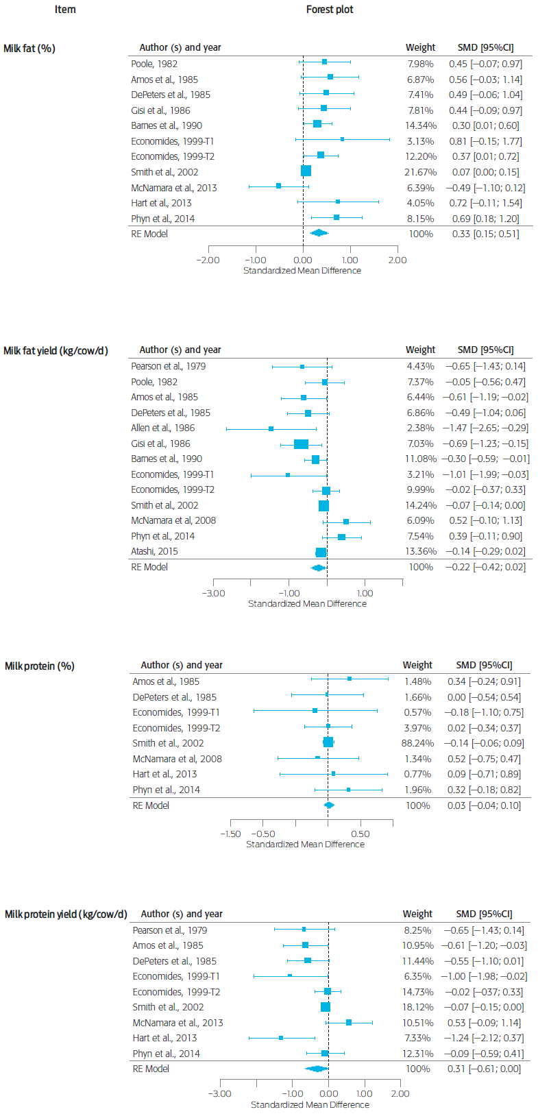 The parameters evaluated were DMI, milk production, and percentages and yields of milk fat and protein. The data set included mean, standard deviation, and number of cows per treatment group. Production parameters of the studies used in the meta-analysis averaged 21.40±4.84 kg/d of DMI, 27.44±5.07 kg/d milk yield, 3.71±0.34 % milk fat, 1.01±0.19 kg/d milk fat, 3.15±0.27 % milk protein, and 0.93±0.16 kg/d milk protein. The precision of the estimate was based on the standard deviation for treatment and control groups reported in the article. When the article did not provide the standard deviation, it was calculated by multiplying the standard error of the mean by the square root of the number of cows. Some studies did not report yields of milk fat and protein, and these were estimated from their percentages in milk. In this case, the standard error from their respective milk fat and protein percentages were used. This strategy was adopted to increase the amount of milk fat and protein yield data, which improved the power of the meta-analysis for these parameters.