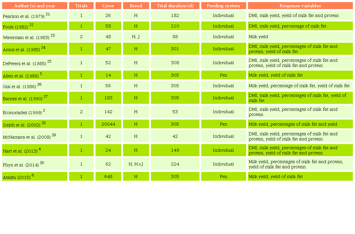 A literature search was performed in PubMed, Google Scholar, and Agricola-USDA, together with citations in reviews or scientific papers for a more comprehensive search. Selected studies had to meet the following criteria: 1) use of lactating dairy cows as experimental units; 2) report information on dry matter intake (DMI), milk production, and milk composition; 3) include contrasts between twice (2x) and thrice (3x) daily milking sessions; and 4) report the standard error, or the standard deviation of the mean for the variables measured. A total of 21 publications were found, but only 14 met the previous criteria for conducting the meta-analysis. Three of the articles used in the meta-analysis were pen studies, and two used Jersey cows and reported two different trials (Table 1). Only a single study used lactating dairy cows on pasture30. The average trial duration was 220+102 milking days.