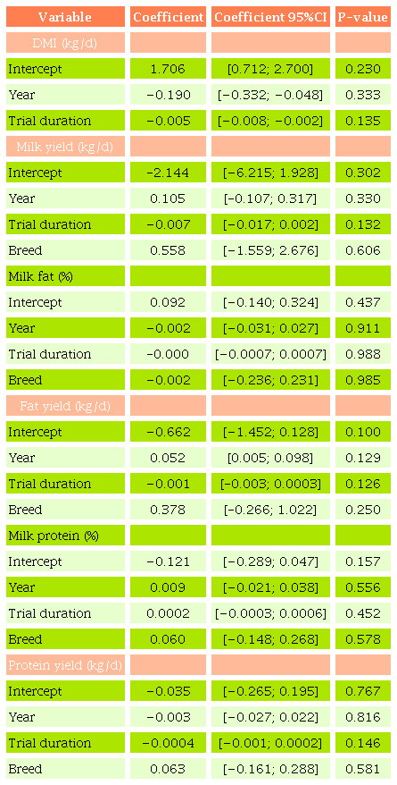Meta-regression analysis demonstrated that the year of publication, the trial duration, and cattle breed did not contribute to the heterogeneity of milk production parameters (P>0.05; Table 2).