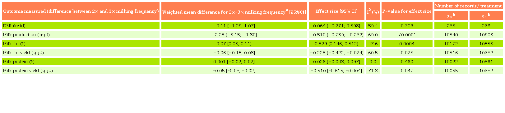 The papers of the present meta-analysis were strictly confined to those that reported DMI, milk production, and milk composition. This selection was an attempt to identify better the effect of increasing milking frequency on milk production ruling out the interference of stage of lactation, feeding system, type and quality of the diets, and lactation number.