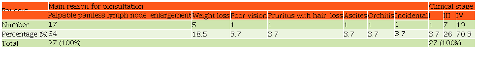 It took owners a mean of 50 days (1-66 days) to take their dogs to a veterinarian, after having detected an abnormality. The main reason for consultation was palpable painless lymph node enlargement in 64% (17/27). In the remaining patients, the reasons were varied, including weight loss, poor vision, pruritus with hair loss in the patient with cutaneous lymphoma, peritoneal effusion, and orchitis. In one dog, lymphoma was an incidental pathological finding on a lymph node removed due to mammary cancer (Table 1). By the time these dogs were evaluated at the HVE, most of them (24/27, 88.9%) had evident peripheral nodal involvement with clinically measurable disease, weight loss documented in 22%, and fever in 18.5%. The prognostic impact of these clinical manifestations has not been studied in dogs and would require a large prospective study to determine if factors such as fever and weight loss bear prognostic significance,23 like they do in humans.