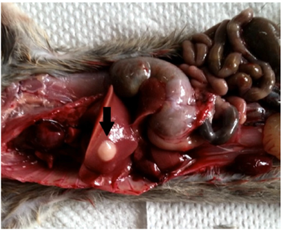 Cysticercus fasciolaris is the larval stage of the adult tapeworm Taenia taeniaeformis (Cestoda), a parasite that presents a global distribution and develops mainly in the small intestine of domestic (Felis cattus) and wild felines (e.g., Felis rufus, Felis silvestris, and Panthera pardus).1,2 Felines get infected naturally by consuming contaminated livers from intermediate hosts.3 However, infection has also been identified in domestic (Canis lupus familiaris) and wild canines, such as red foxes (Vulpes vulpes), and coyotes (Canis latrans).4,5 Laboratory animals that have been experimentally infected with C. fasciolaris have a prepatent period of 34-80 days (41.1 ± 5.9), at the end of which the ingested larvae has developed and become fully infectious.6 An adult T. taeniaeformis tapeworm produces close to 12,000 partially developed eggs (called oncospheres) daily, which are released from the proglottids of the parasite, and shed into the environment with infected host feces.7 Intermediate hosts of T. taeniaeformis are mainly small rodents and lagomorphs, which can become infected by consuming food or water contaminated with viable oncospheres.8 Under experimental conditions, one-month old white mice can get infected with low numbers of eggs (200-500), and develop 11-250 metacestodes in the liver.9,10