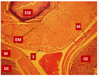 Six New Zealand rabbits (Oryctolagus cuniculus), between 2.5 and 3.5 kg of weight were used. Animals were laid supine with a 15° anti-Trendelenburg position, and access ports were established. A first port was placed in the midline, between the last two pairs of mammary glands, where a 10 mm trocar for the lens was introduced by blunt dissection (Hasson technique). A 0° telescope was used. The abdomen was insufflated through this port reaching a 10mmHg pressure. Once intra-abdominal vision was achieved, three additional 3 mm ports were established, one slightly cranial to the right and two slightly cranial to the left of the telescope (Fig. 1). The stomach, hiatal region and esophagus were identified. Conventional surgical instruments, such as Maryland forceps, needle holders and scissors, were used for the procedures. The surgeon utilized the two 3 mm ports located immediately adjacent to the telescope. In addition to handling the lens, the surgical assistant helped the surgeon with the esophagus dissection by using the farthest port from the left side, in order to restrain the stomach with forceps at the antrum. The stomach was pinched with forceps at the antrum to create traction. The esophagus was then dissected and separated from the diaphragmatic cruras. Care was taken to preserve the vagus nerves. The gastric fundus was subsequently passed behind the esophagus, and a 360º “floppy” Nissen fundoplication fixed with three surgical knots was performed using a 3-0 poliglactin 910 suture. All animals were euthanized after surgery completion, and digestive tract patency and presence of leaks were assessed. Next, surgically concerned organs were resected for histopathological examination (Fig. 2).