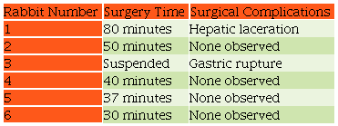 Rabbit surgery requires technical knowledge of anesthetic procedures, hence a veterinary team with experience in laboratory animal management.42 Trans-surgical management of rabbits requires endotracheal intubation, to counteract the effect of the pneumoperitoneum; failure to do so will cause respiratory failure and death.43,44