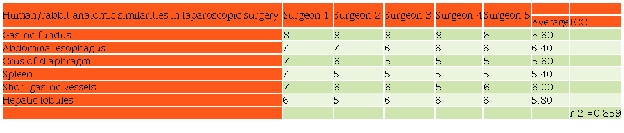 For statistical analyses, SPSS for Windows 10.0 was used. The Cronbach’s alpha coefficient was calculated for technical difficulty of the surgery. Average scores were determined for similarities of anatomical structures between the rabbit model and the adult human; and a correlation coefficient (ICC) was calculated to assess consistency between observers.9,30